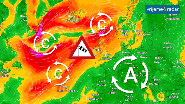Vjetroradar prikazuje: Olujni do orkanski vjetrovi širom sjevernog Atlantika pod utjecajem snažnih ciklona narednih dana.
