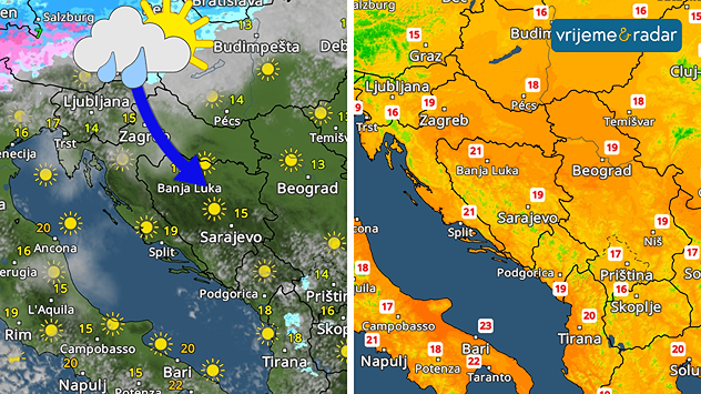U nedjelju umjereno-potpuno oblačno uz povremenu kišu, na Jadranu ponegdje i pljuskove sa grmljavinom, te svježije. Vjetar na kopnu slab do umjeren sjeveroistočni, a na Jadranu će umjereno, mjestimice i jako jugo te jugozapadnjak okretati na zapadni i sjeverozapadni vjetar, na sjevernom dijelu jačati bura. Temperatura danju od 11 do 14°C, na Jadranu 16-21°C. U ponedjeljak sredinom dana pretežno sunčano. Ujutro uz više oblaka još lokalno kiša, na jugu i grmljavina. U unutrašnjosti je ponegdje jutarnja magla. Prema večeri sa sjeverozapada porast naoblake, krajem dana i u noći na utorak ponegdje kiša. Vjetar slab do umjeren jugozapadni i južni, u višem gorju poslijepodne i jak. Na Jadranu umjeren sjeverozapadnjak sredinom dana u okretanju na jugozapadnjak. U utorak i srijedu pretežno sunčano, mjestimične kiše može biti uglavnom na sjevernom Jadranu i u Gorskom kotaru u srijedu. Danju toplije na kopnu, jutra hladnija. PROGNOZA VREMENA ZA BOSNU I HERCEGOVINU: Kišovita nedjelja, pa sunačnije, jutra hladnija U nedjelju promjenljivo oblačno sa povremenom kišom, u Hercegovini i pljuskovi sa grmljavinom. Vjetar većinom slab na sjeveru, na planinama i u Hercegovini umjeren-pojačan južni. Temperatura od 11 do 20°C, svježije na sjeverozapadu. Početkom nove sedmice stabilnije. U ponedjeljak ujutro još s kišom, na višim planinama i snijegom, već od jutra razvedravanje sa sjeverozapada, danju pretežno-djelomice sunčano. Noću na utorak nove prolazne padavine, u utorka danju ponovo pretežno-djelomice sunčano, kao i u srijedu. Danju malo toplije, jutra svježija. PROGNOZA VREMENA ZA CRNU GORU: Nedjelja ponegdje sa obilnijom kišom. Poželjeli ste Sunce? U nedjelju umjereno-potpuno oblačno s povremenom kišom, poslijepodne i noću moguće obilnije padavine. Umjeren i jak jugozapadni vjetar nastavlja puhati u višim predjelima. Temperatura danju na sjeveru od 8 do 17°C, na jugu oko 21°C. U ponedjeljak još ponegdje kiša ujutro, danju razvedravanje. U drugom dijelu noću na utorak i utorak ujutro, ponovo kiša, ali danju razvedravanje. Srijeda pretežno sunčana. Toplije prema sredini sedmice.