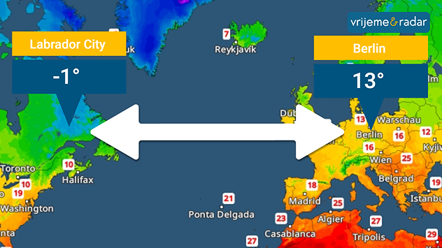 Situacija je sasvim drugačija ako se krećemo dalje na zapad duž geografske širine. Tada završavamo u kanadskoj pokrajini Newfoundland. Grad Labrador City nalazi se na približno istoj geografskoj širini kao i Berlin. Tamo već ima mraza i snijega.