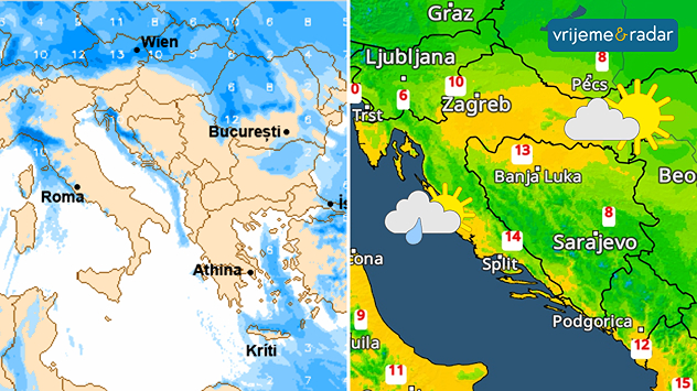 Prognozirane oborine do petka - lijeva slika; Rast temperatura narednih dana pokazuje TemperaturniRadar - desna slika.