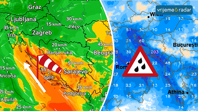 VjetarRadar prikazuje jak-olujno jugo i južni vjetar, narednih dana ostaje promjenljivo, najviše kiše na Jadranu i navjetrinskoj strani Dinarida
