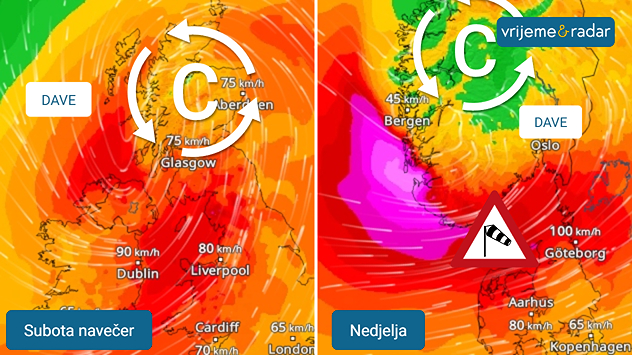 VjetarRadar Oluja Dave drži dijelove Ujedinjenog Kraljevstva (lijevo) i južne Skandinavije (desno) u neizvjesnosti tijekom uskrsnog razdoblja.
