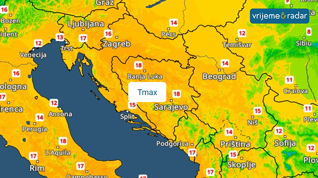 TemperaturniRadar pokazuje iznadprosječno toplo vrijeme, danju nerijetko preko 15°C