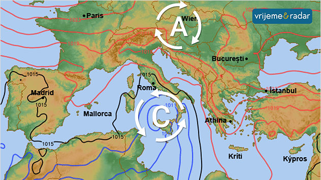 Sjevernije ostaje djelovanje anticiklone, ali uz mirno vrijeme niska oblačnost i magla neće nedostajati. Ciklona dolazi s juga – donijet će nekima oborine/kišu.