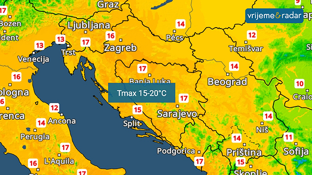 TemperaturniRadar prikazuje proljetne temperatue danju, između 15 i 20°C