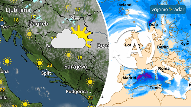 Frontalni sustav će donijeti oblake, rijetko kišu, a iza njega nešto hladniji zrak sa sjevera. Na Jadranu i jugu ostaje još sunčano i ugodno toplo. Anticiklona ostaje djelovati.
