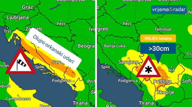 Upozorenje na jak i olujni vjetar na Jadranu, Hercegovini i Crnoj Gori. Podno Velebita orkanski udari. U višim predjelima označene regije preko 30cm snježnog pokrivača.