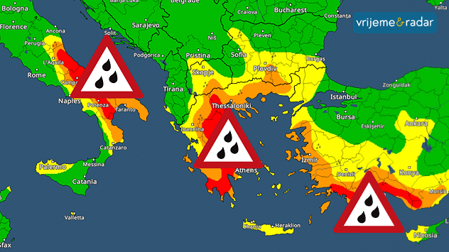 U utorak se nad Sredozemljem stvara olujni sustav. Tijekom sljedećih nekoliko dana donijet će obilne kiše, grmljavine i jake vjetrove, posebno jugoistočnoj Italiji i od Grčke do turske rivijere.