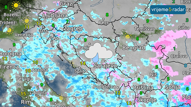 Promjenljivo-potpuno oblačno, na jugu sunčani intervali, ponegdje slaba kiša. Od utorka do četvrtka češća kiša na zapadu i u Hercegovini, u ostatku zemlje rjeđa. U srijedu i četvrtak na sjeveroistoku-jugoistoku sunčani intervali. Snijeg samo na vrhovima viših planina.