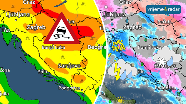 Upozorenje na skliske/klizave ceste, na sjeveru regije i istoku je moguća ledena kiša i stvaranje sloja leda