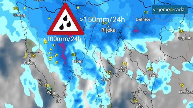 Vrijeme&Radar prikazuje umjerene i jake oborine u četvrtak navečer u Istri i okolici Rijeke
